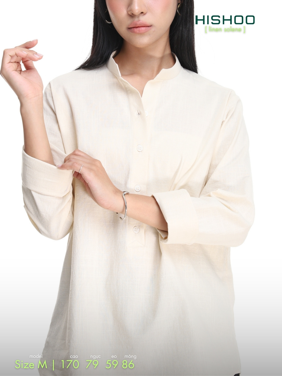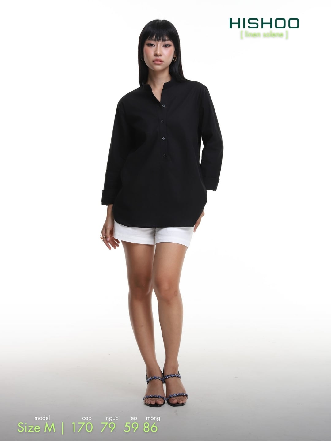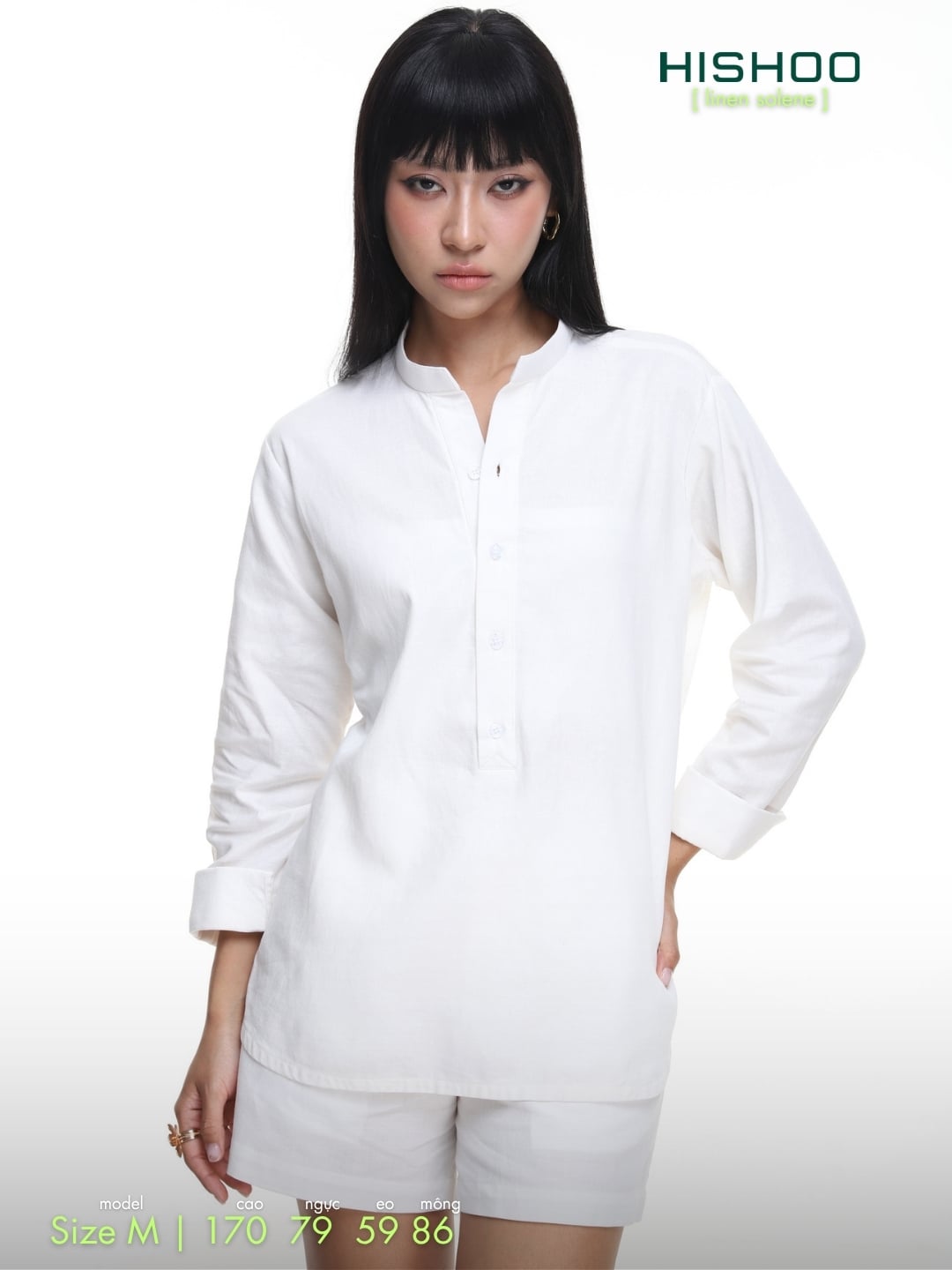 - Thiết kế: tay dài, cổ tàu vuông, cài nút trước