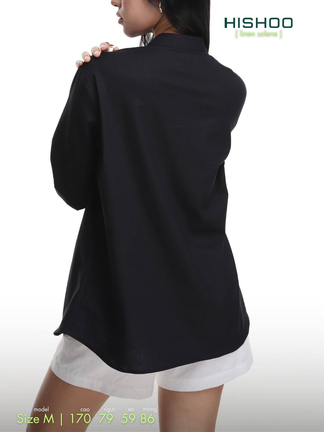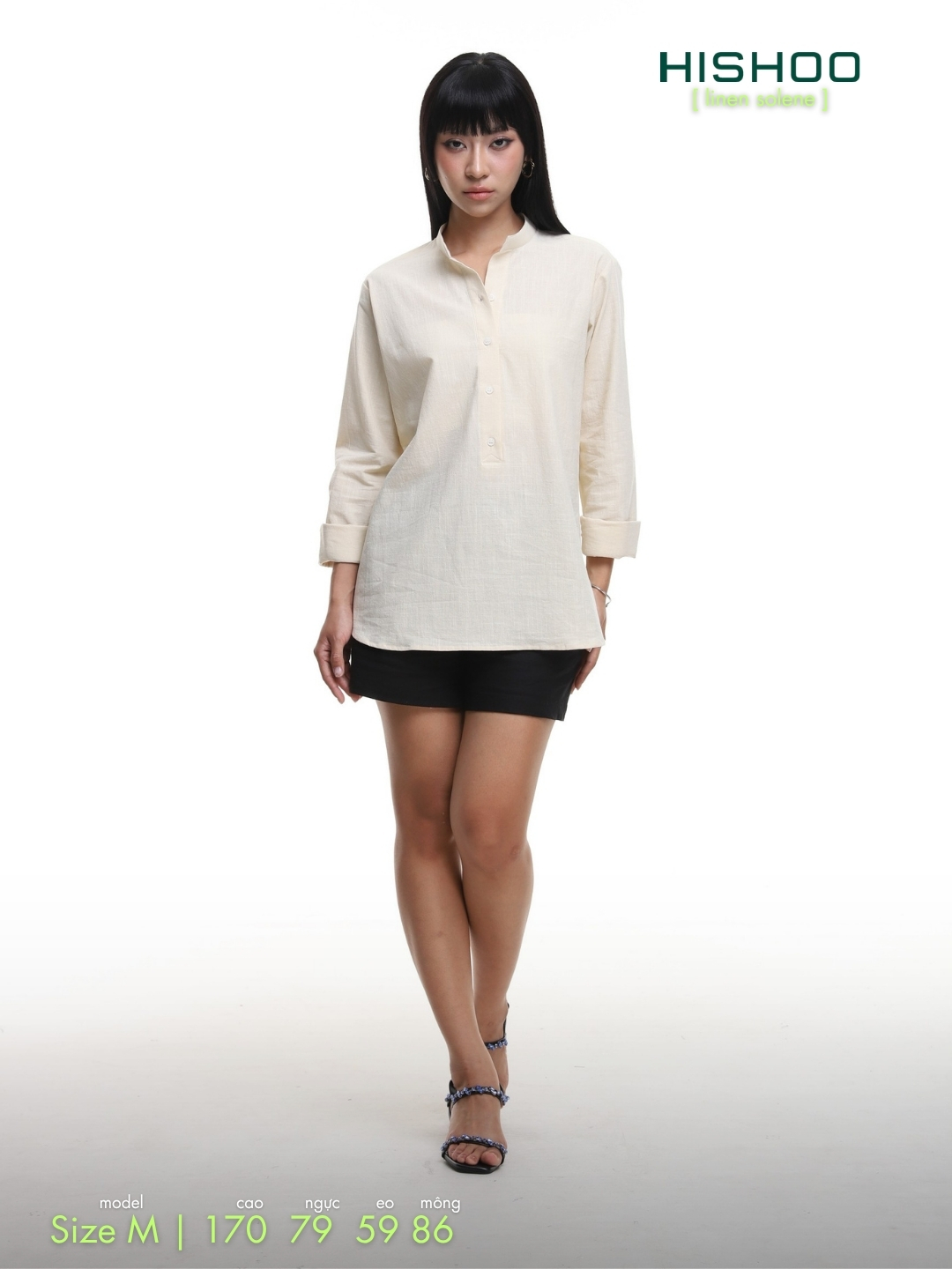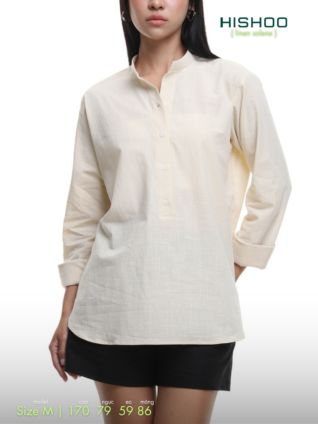 - Thiết kế: tay dài, cổ tàu vuông, cài nút trước
