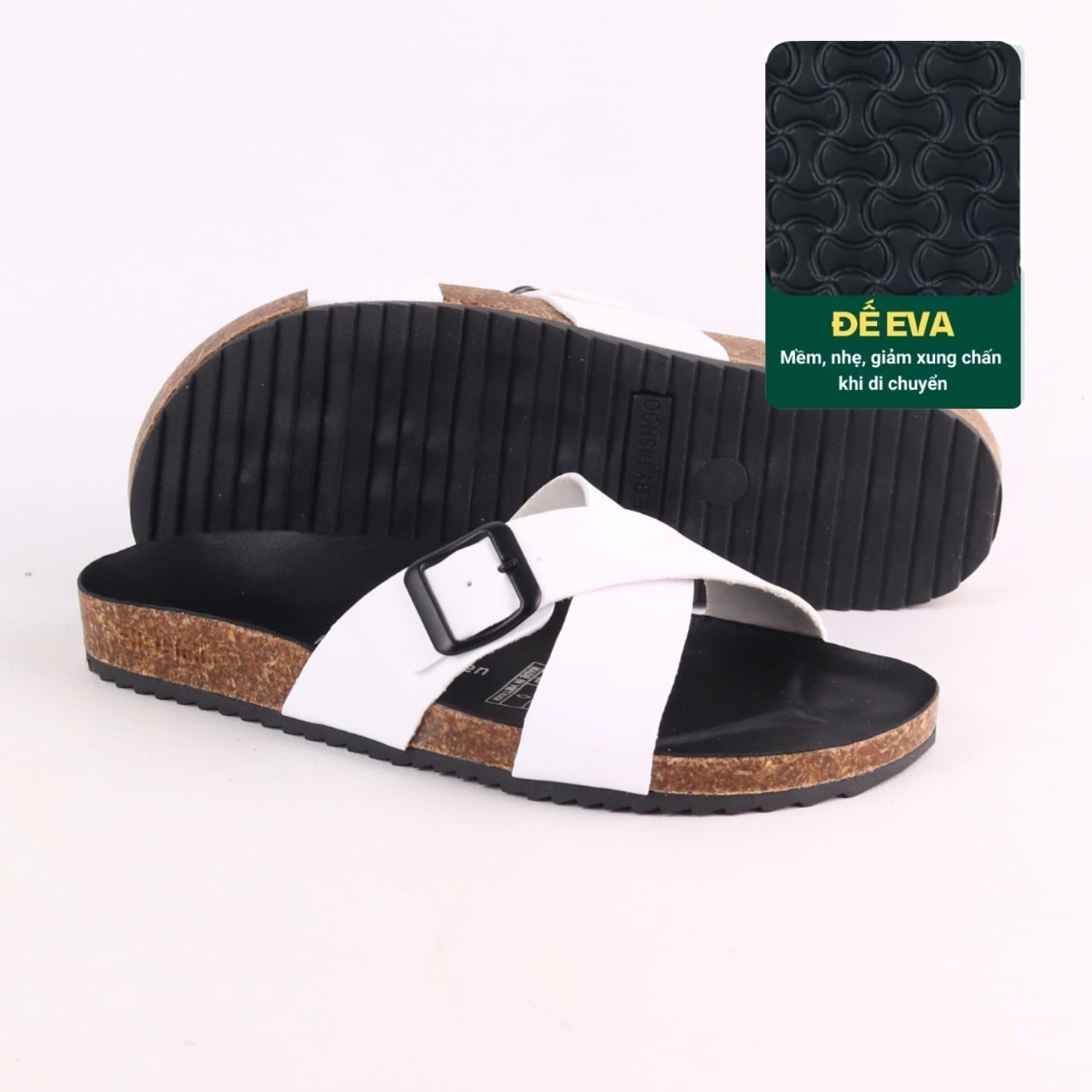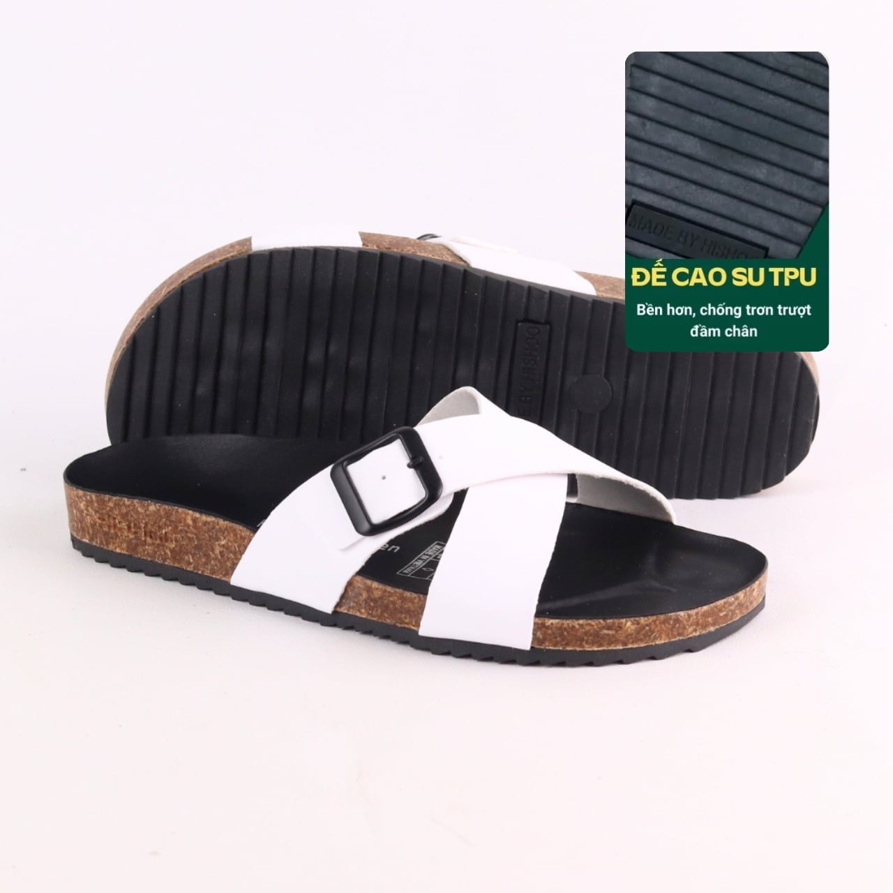 - ĐẾ TRẤU: Được sản xuất từ Vỏ Trấu và được kết hợp với keo để tạo ra một lớp đệm mềm mại và dẻo dai. Điều này giúp cho đôi dép của Hishoo có tính năng thoải mái và êm ái hơn so với các đôi dép khác trên thị trường.