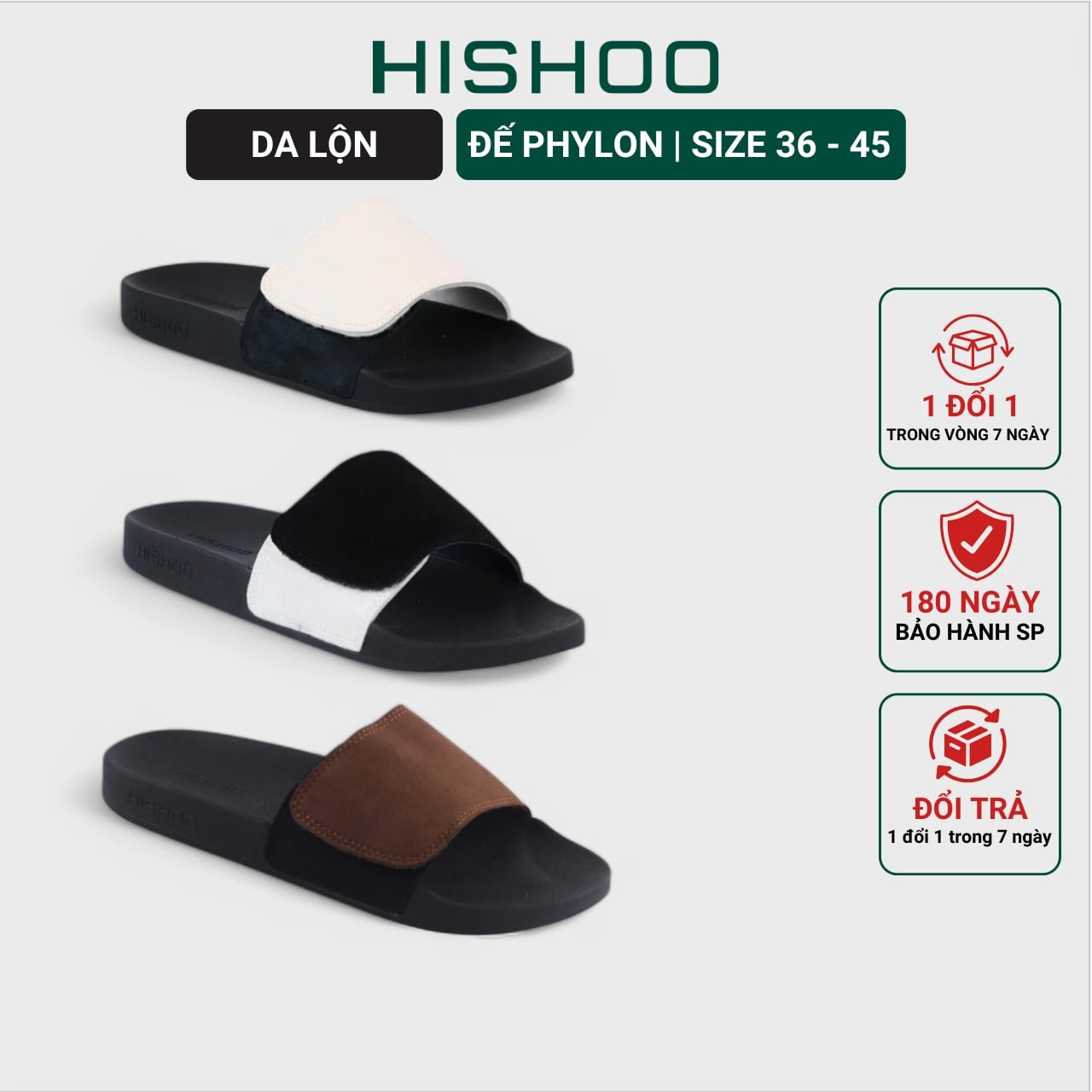 - PHẦN QUAI: được làm bằng DA BÒ THẬT, mềm mại và êm ái, giúp người sử dụng cảm thấy thoải mái khi đi dép. Xử lý công nghệ SmellBlock* giúp HẠN CHẾ HÔI CHÂN. Đặc biệt, quai dép của Hishoo được thiết kế vừa vặn với đôi chân, không gây khó chịu hay hằn sâu vào da chân, giúp cho người sử dụng có thể di chuyển một cách dễ dàng và thoải mái.