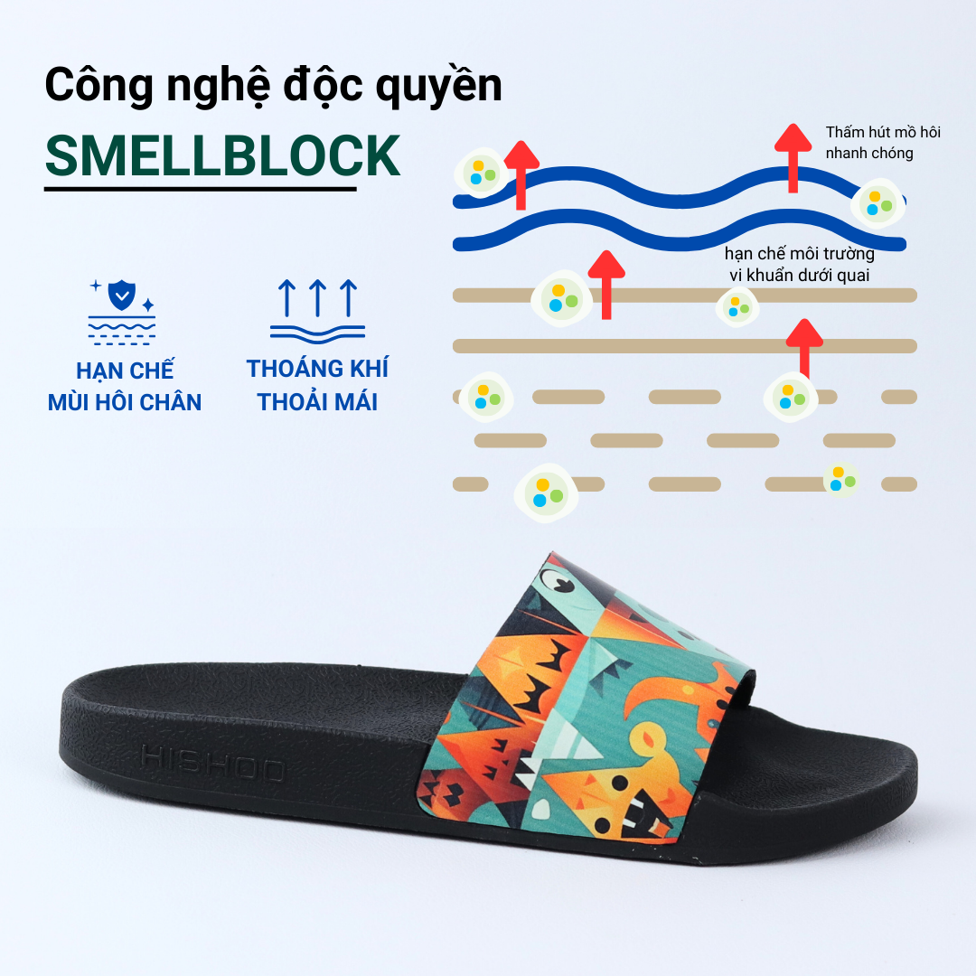 *SmellBlock của Hishoo là một công nghệ tiên tiến được áp dụng trong quá trình gia công da động vật. SmellBlock giúp giảm bớt mùi hôi trên da bàn chân và mang lại cảm giác thoải mái, khô ráo cho bàn chân của bạn. Công nghệ này còn giúp tạo sự thoáng thích và thông gió cho đôi dép của bạn, giúp thoát nhiệt, hơi ẩm và đánh bay mồ hôi. Đặc biệt, SmellBlock giúp khử mùi hôi cả ngày dài mà không cần phải lo lắng về mùi hôi khó chịu từ đôi chân của bạn.