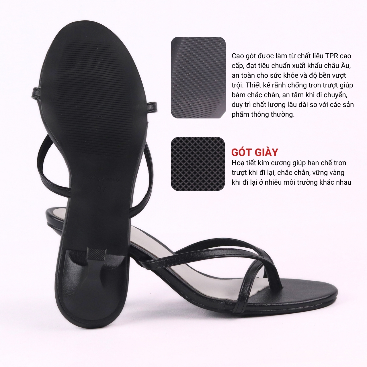 - Chất liệu đế: Cao su cao cấp dùng cho hàng xuất khẩu
